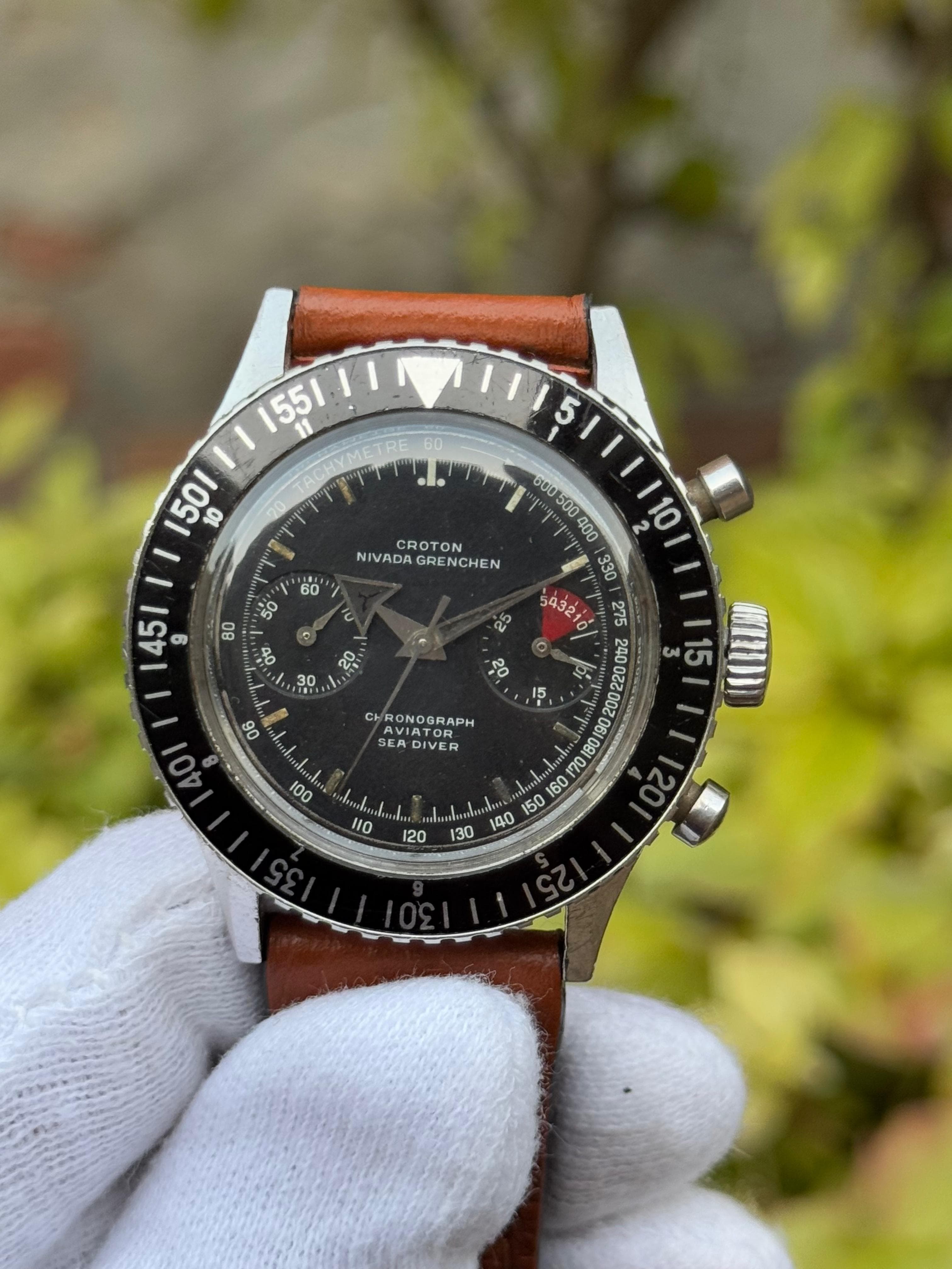 Le Chronomaster Aviator Sea Diver est l'un des chronographes vintage les plus recherches. Produit conjointement par Croton (USA) et Nivada Grenchen (Suisse), il combine les fonctions de chronographe, montre de pilote et montre de plongee. La lunette bidirectionnelle, le cadran noir avec compteurs et l'aiguille rouge du chronographe en font une piece visuellement saisissante. Le mouvement Valjoux 23 est repute pour sa fiabilite. Cette reference est devenue culte aupres des collectionneurs de chronographes vintage.