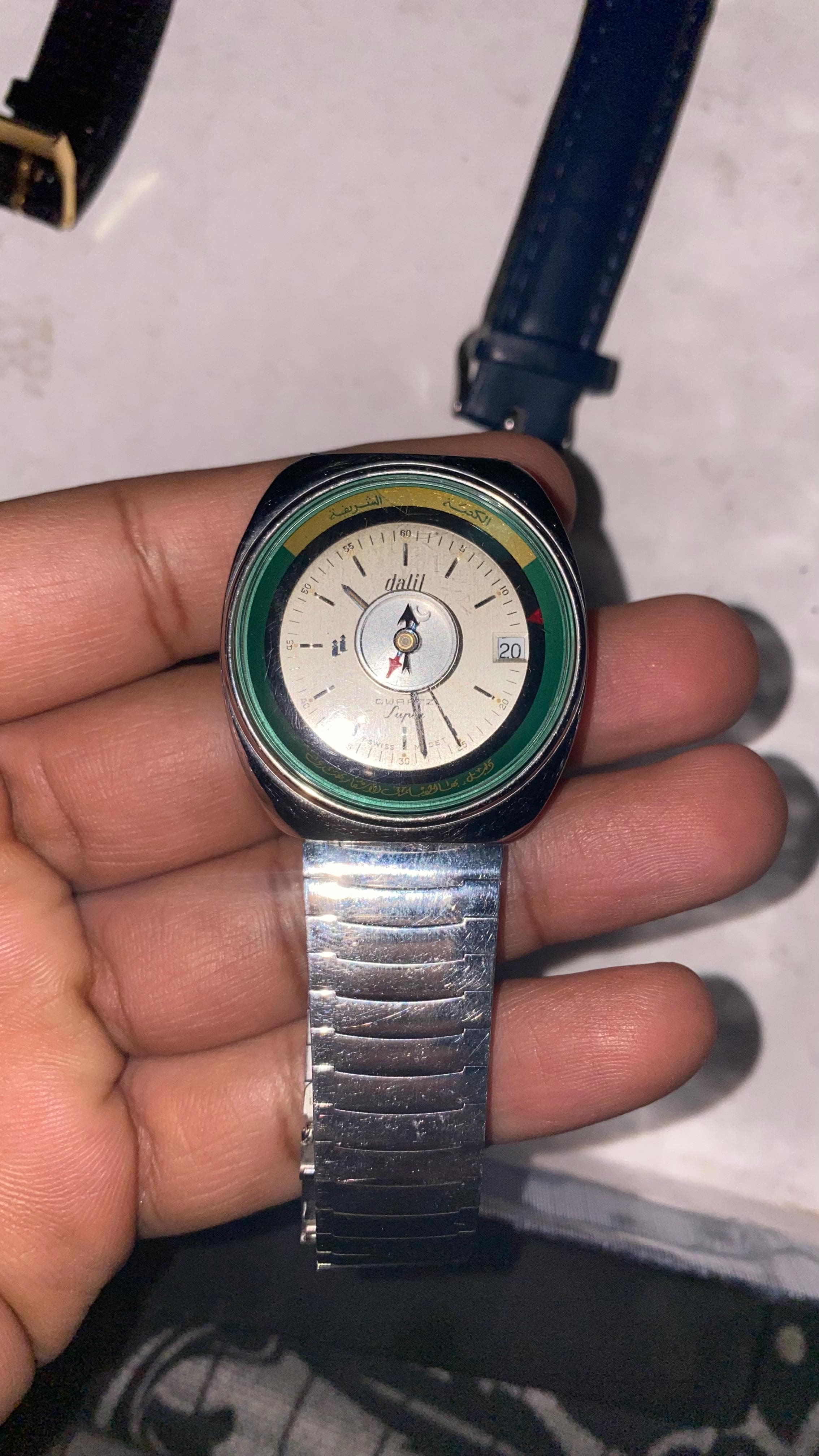 Seconde variante de la Dalil Monte Carlo, cette fois sur bracelet acier extensible d'epoque. Meme design space-age avec le cadran vert et dore signature, mais dans une version plus decontractee. Le bracelet accordeon en acier ajoute au charme retro de l'ensemble. Une piece de caractere pour les amateurs de design 70s atypique.